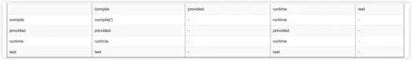如果依赖关系为: A--->B--->C,A 依赖 B,B 依赖 C。最左列代表 B 的 scope 属性,第一行代表 C 的 scope 属性
