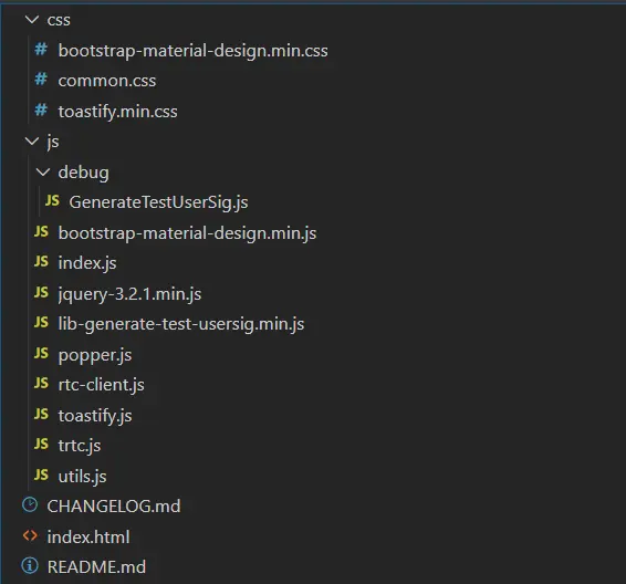 css就不讲了,js中debug文件夹的GenerateTestUserSig是用来生成SDKAppID和SECRETKEY的,后期会被后端提供的相关接口替代;