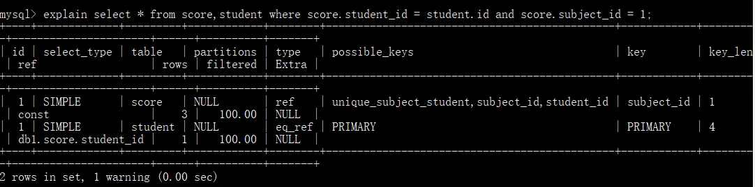 key列显示MySQL实际决定使用的键(索引),必然包含在possible_keys中