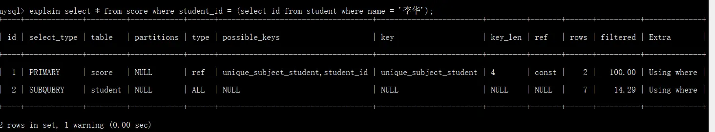 Impossible where:这个值强调了where语句会导致没有符合条件的行(通过收集统计信息不可能存在结果)。