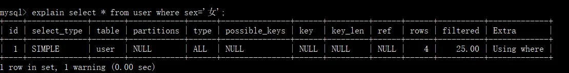 Using join buffer:改值强调了在获取连接条件时没有使用索引,并且需要连接缓冲区来存储中间结果。如果出现了这个值,那应该注意,根据查询的具体情况可能需要添加索引来改进能。