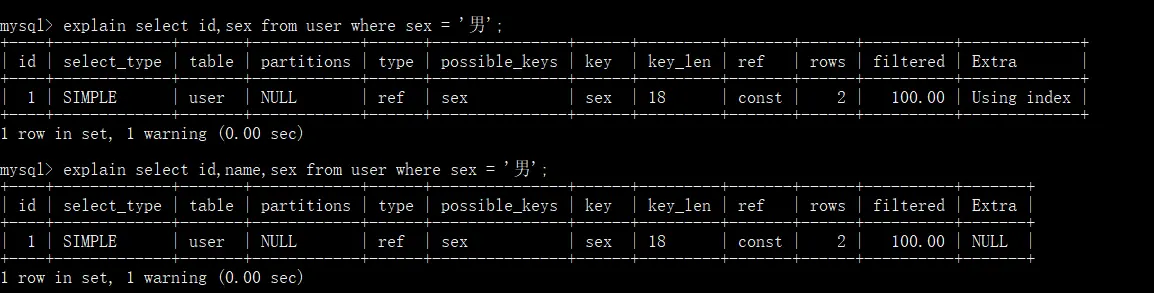 Using where:不用读取表中所有信息,仅通过索引就可以获取所需数据,这发生在对表的全部的请求列都是同一个索引的部分的时候,表示mysql服务器将在存储引擎检索行后再进行过滤