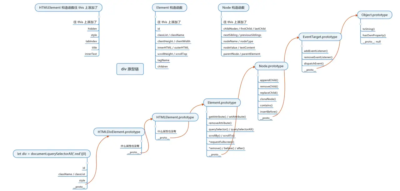- 第一层原型HTMLDivElement.prototype:这里面是所有div元素的共有的属性