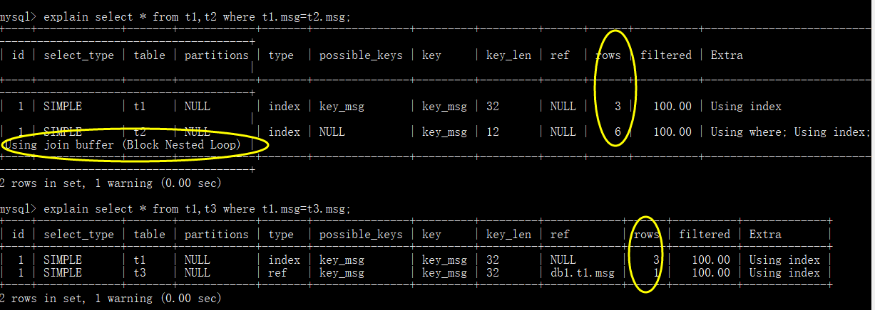 (3)t1和t3相join时,遍历了t1的所有记录3条,t1的每一条记录使用t3索引,即扫描1行记录