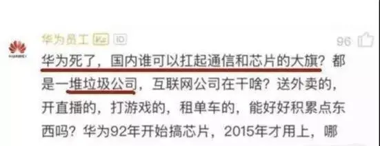 近日,我看到有华为员工在网上发帖表态:现在很多互联网公司都将主营业务转向了送外卖,游戏开发,租单车等,真正还在脚踏实地做互联网研究的屈指可数。在这种环境下,如果领军者华为倒下了,还有哪家能够真正扛起通信界的大旗?