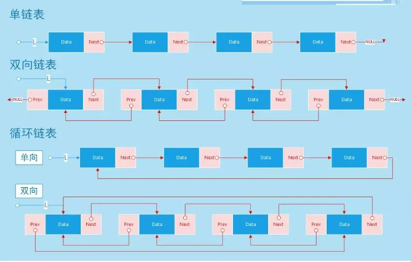 Double Circular Linked List双向循环链表: 由各个内存结构通过指针Next和指针Prev 链接在一起组成,每一个内存结构都存在前驱内存结构和后继内存结构,内存结构由数据域,Prev指针域和Next 指针域组成。