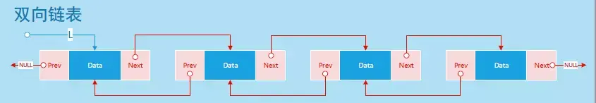 双向链表:由各个内存结构通过指针Next和指针Prev 链接在一起组成,每一个内存结构都存在前驱内存结构和后继内存结构(链头没有前驱,链尾没有后继),内存结构由数据域,Prev指针域和Next指针域组成。