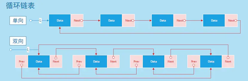单向循环链表 : 由各个内存结构通过一个指针Next 链接在一起组成,每一个内存结构都存在后继内存结构,内存结构由数据域和Next指针域组成。