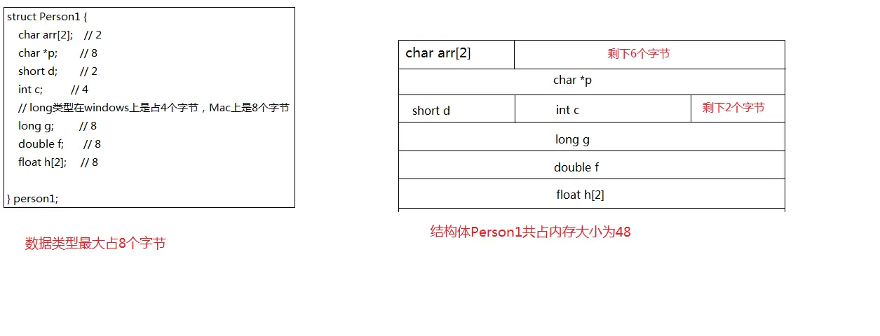 为什么Person1与Person2所占的内存大小不一样?因为结构体是根据数据类型进行内存对齐的。如下图