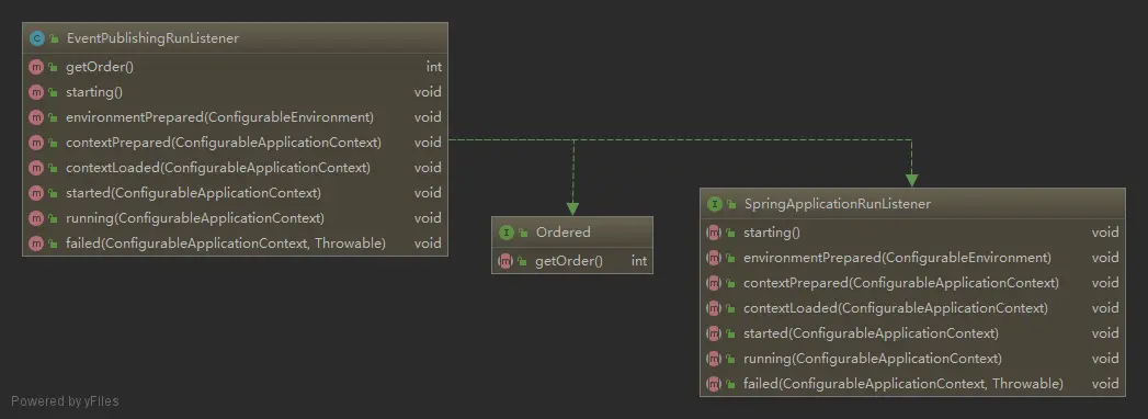 该监听器实际上是一个用于广播Spring事件的广播器,实现SpringApplicationRunListener接口的方法都是包装一个Spring事件并进行广播,例如: