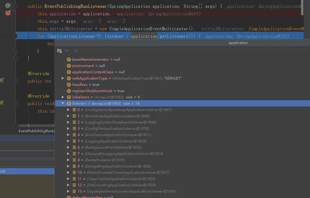 调试发现,注册为SpringApplicationRunListener的实现类只有EventPublishingRunListener,之前说过该注册器是一个用于广播Spring事件的广播器,进到构造函数中可以看到都有哪些监听器被绑定到了这个广播器中,这里每个监听器的作用就不再深入了,需要说的是,如果在项目中有什么需要集成到Spring的框架,可以注册SpringApplicationRunListener\ApplicationListener的实现类,监听Spring的不同启动事件并执行集成的逻辑。当然也有别的方法,例如: