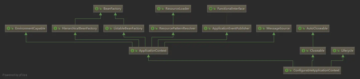 Closeable提供了关闭时资源释放的接口,Lifecycle是提供对生命周期控制的接口(start\stop)以及查询当前运行状态的接口,ApplicationContext则是配置上下文的中心配置接口,继承了其他很多配置接口,其本身提供查询诸如id、应用程序名等上下文档案信息的只读接口,以及构建自动装配bean的工厂(注释上官方说该接口提供的工厂是用于注册上下文外部的bean的,但调试发现和在程序内@Autowired获取到的工厂是同一个对象...)。简单写下ApplicationContext继承的父类接口。