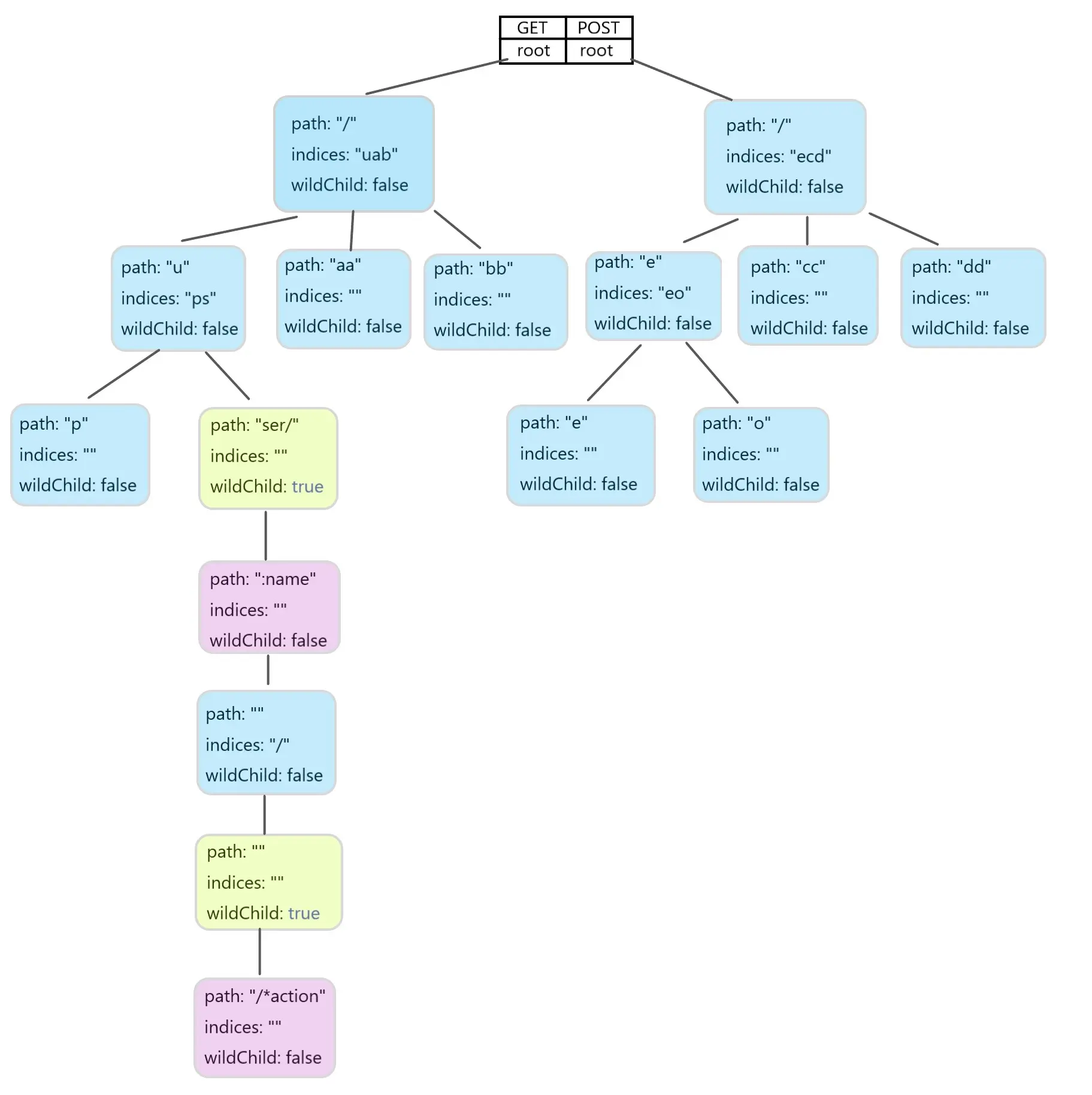 把关注点放在路由的绑定上,这段代码保留了最开始的那个 GET 路由,并且另外创建了 4 个 GET 路由和 4 个 POST 路由,在 Gin 内部,将会生成类似下图所示的路由树。