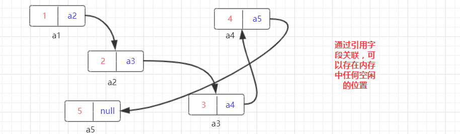 注意:链表中的元素可以存在内存中任何空闲位置,并不一定是连续的,也可以是这样的: