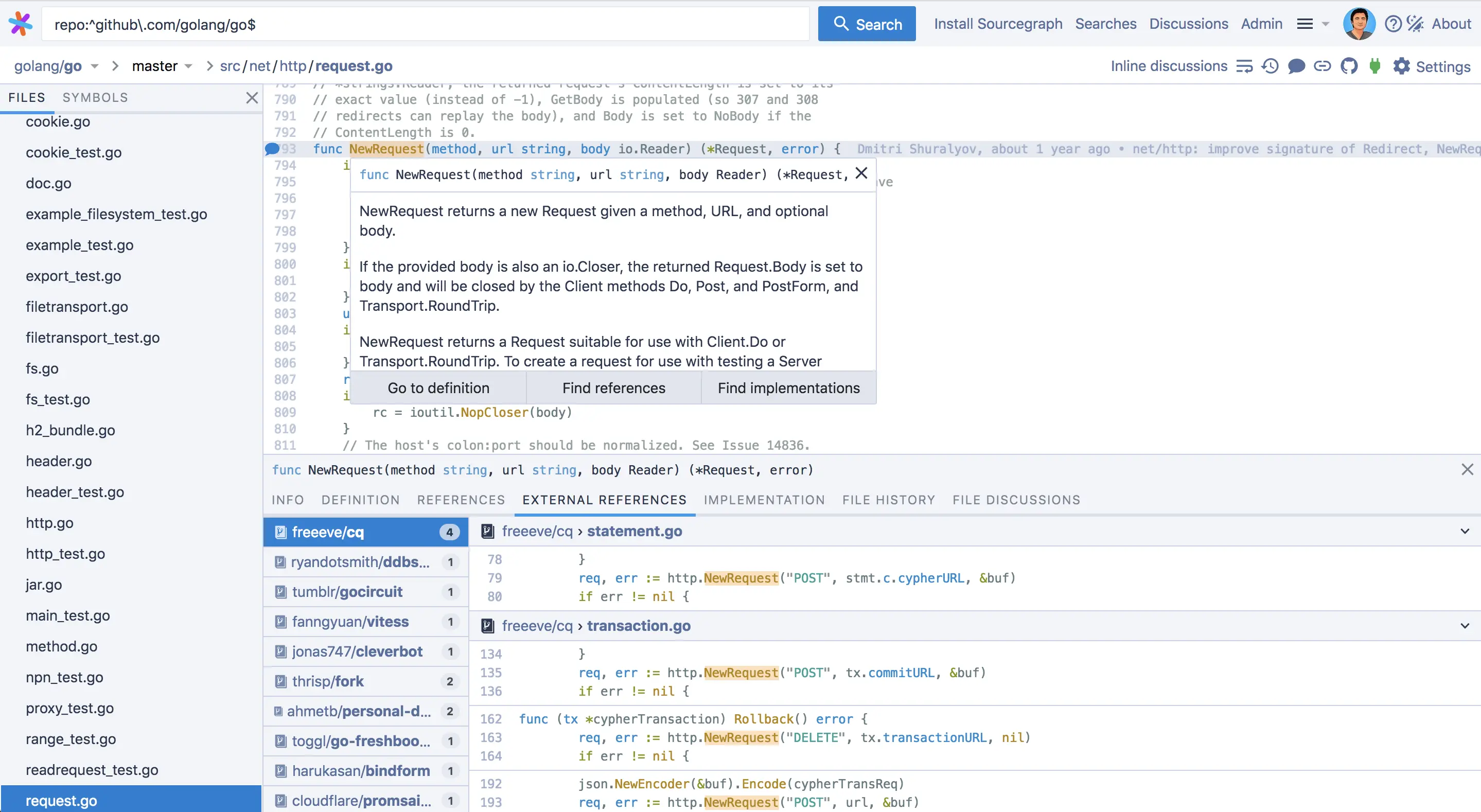 Sourcegraph 是一个代码查看工具,由 Golang 编写而成,它可以为 Github 上的代码添加了即时文档和类型提示,并为每一个标识符添加了跳转到定义处的链接的 Chrome 扩展,它允许你像使用 IDE 那样浏览源代码。 有了 Sourcegraph 之后,你可以从代码仓库和安装包甚至是函数里搜索代码,同时也可以直接点击被完全创建了链接的代码来阅读文档、跳转到变量定义或者马上找到可用的 Demo。