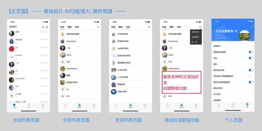 美信拓扑IM Demo是为了演示 IM SDK 各项功能的App应用,代码开源,开发者可以直接在其基础上开发自己的产品,或者以Demo为参照实现其演示的各项功能。