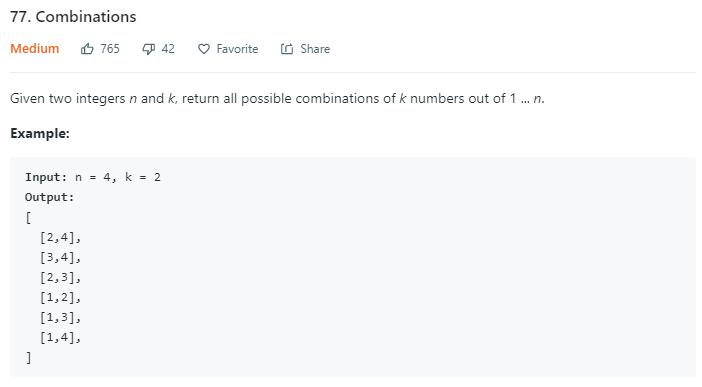 一个 for 循环,添加,递归,删除,很经典的回溯框架了。在这里发现了一个优化方法。for 循环里 i 从 start 到 n,其实没必要到 n。比如,n = 5,k = 4,temp.size( ) == 1,此时代表我们还需要(4 - 1 = 3)个数字,如果 i = 4 的话,以后最多把 4 和 5 加入到 temp 中,而此时 temp.size() 才等于 1 + 2 = 3,不够 4 个,所以 i 没必要等于 4,i 循环到 3 就足够了。