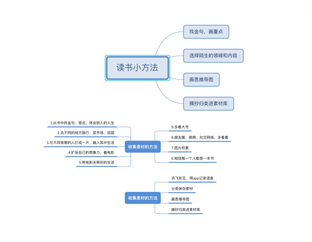 比如听完别人怎么读书的,就可以用脑图把他们的思路大纲画下来,慢慢积累,形成自己的体系:
