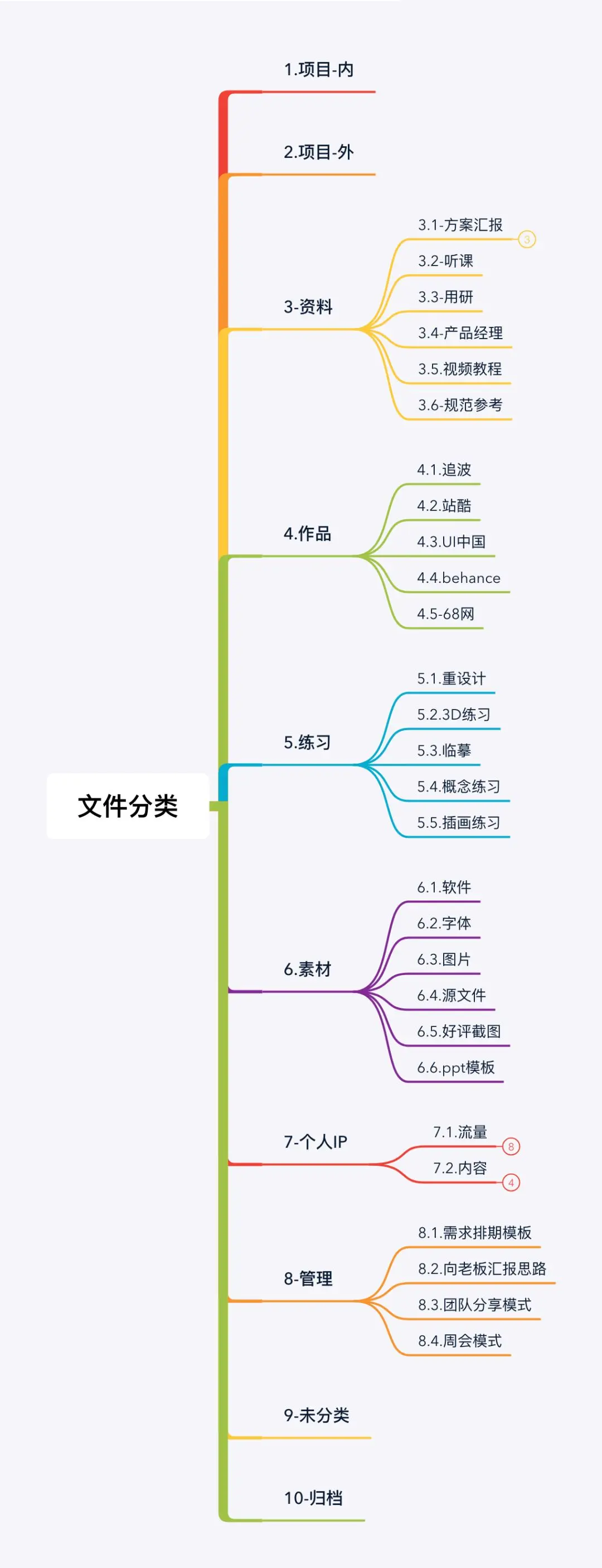 在分类之前,我会先用思维导图把思路整理清楚,目标是把自己所有文件都能科学的规整到指定文件夹中,我的分类大纲如下: