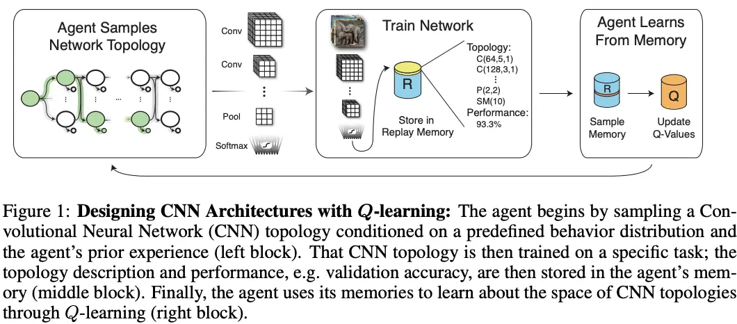 论文提出MetaQNN算法,使用基于强化学习的meta-modeling procedure来自动化CNN结构搭建过程。该方法首先搭建一个全新的Q-learning代理,学习如何发现性能好的CNN结构,发现过程先按顺序选择网络每层的参数,然后对搜索到的网络进行训练和测试,并将测试准确率作为reward,在学习过程中使用了经验回放(experience replay)进行加速
