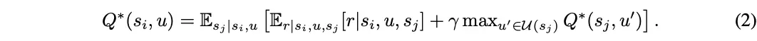 称为Q-values,Q-values的最优解为公式2,即Bellman’s Equation,为当前动作的回报的期望与下个状态的Q值最大的动作的加权求和