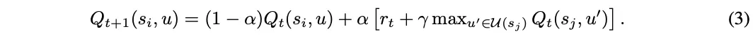 一般不能直接学习到概率来求解Bellman’s Equation,可以转化为迭代式优化,如公式3,为Q-learning的一种简单形式。只要每种转移采样足够多次,就可以很好地逼近公式2,更新公式包含两个参数: