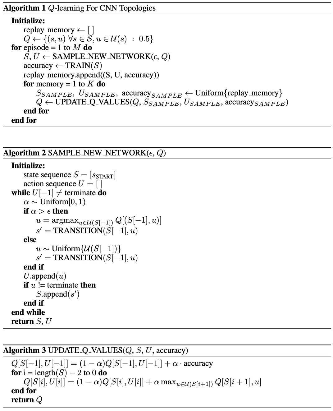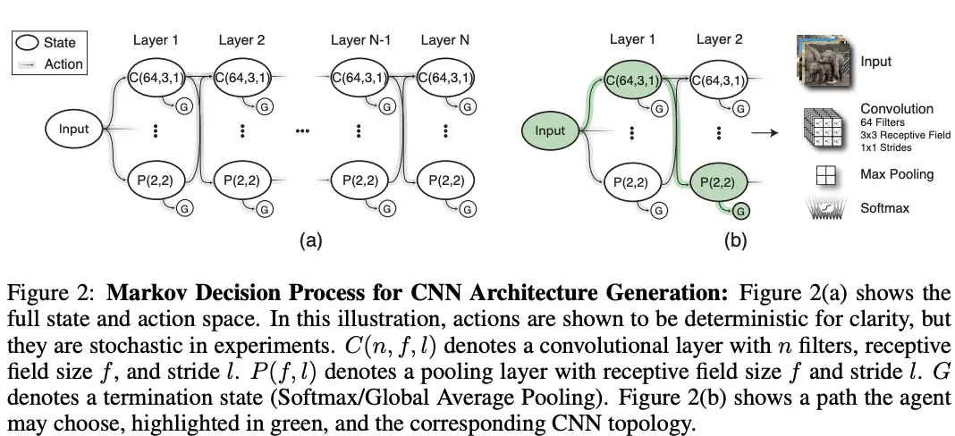 将层选择过程建模为马尔可夫决策过程,假设一个网络中表现好的层也能在别的网络中有很好的表现。代理按顺序通过-greedy策略进行选择直到达到停止状态,从代理的路径中构建CNN网络,然后进行训练并将准确率反馈给代理,将准确率和网络存到回放存储(replay memory)中,定期从回放存储中采样进行公式3的Q-values更新