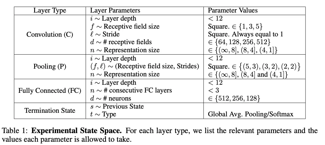 每个状态为一组层相关参数,如表1所示,共有6种层类型,网络每层都预有一个***layer depth***来表示当前层的位置,从而进行action的约束,保证网络为有向无环图(DAG)