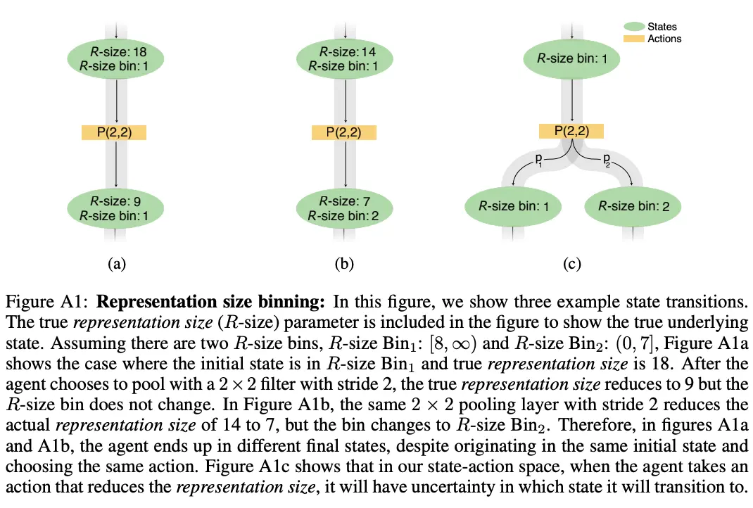 为了避免感受域大于特征图大小,每层有一个***representation size***(R-size),为特征图大小,根据R-size进行两个action的约束,限制R-size为n的状态的action的感受域必须小于或等于n来保证输出不会太小,而为了更好的约束,将R-size值分为3个离散区间,但这有可能导致生成的状态在另一个不同的区间,如图A1所示