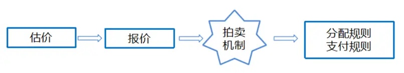 从上面的问题描述可以看出整个拍卖活动涉及到买家的估价、买家的报价、卖家的资源分配、买家的支付等环节,如下图所示。拍卖机制的核心问题就是制定或设计一套能够达成最大化期望收益,且能够保证买家与卖家长期可持续发展的机制。