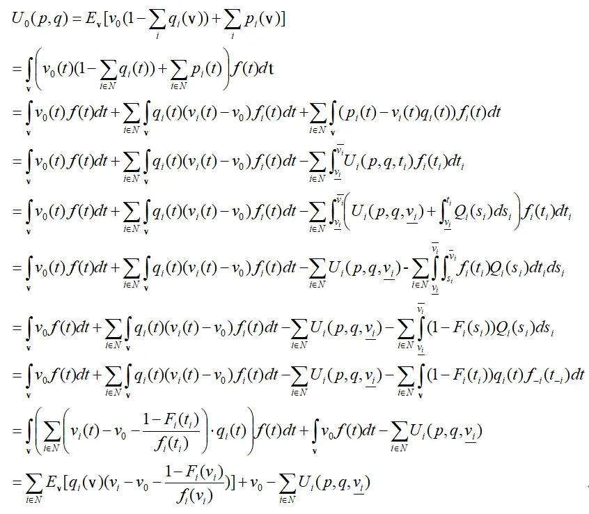 可行机制的描述公式(1), (4), (5)有很强的物理解释,但不能直接用于最优机制的推导,为此我们先推导出可行机制的另一种形式(充要条件),也即下文中的公式(7), (8), (9)。