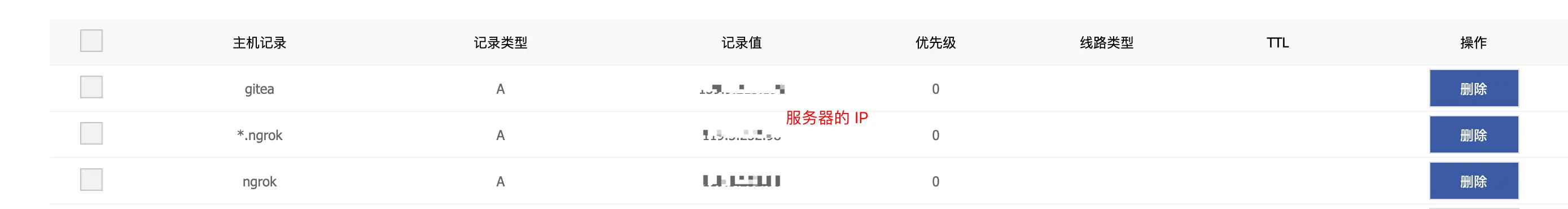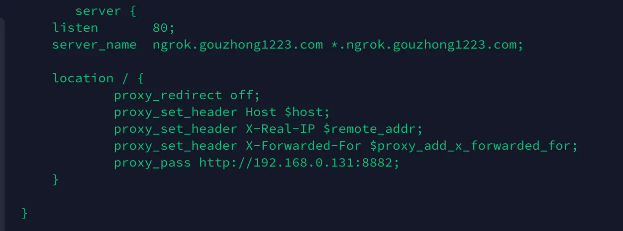 这里我解析了一个泛域名到服务器上是为了方便以后拓展,意思就是类似于 xxx.ngrok.gouzhong1223.com 的域名我们以后也能进行穿透。
