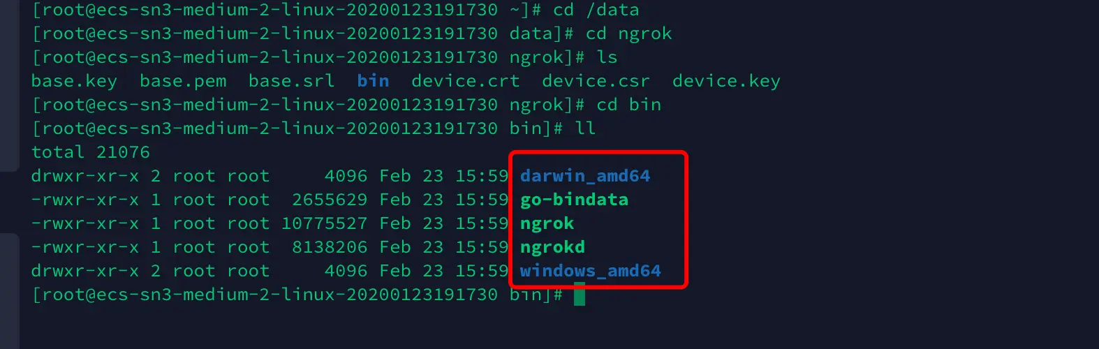 等到完成之后,在我们宿主机的 data/ngrok 目录下面就会有这样几个文件