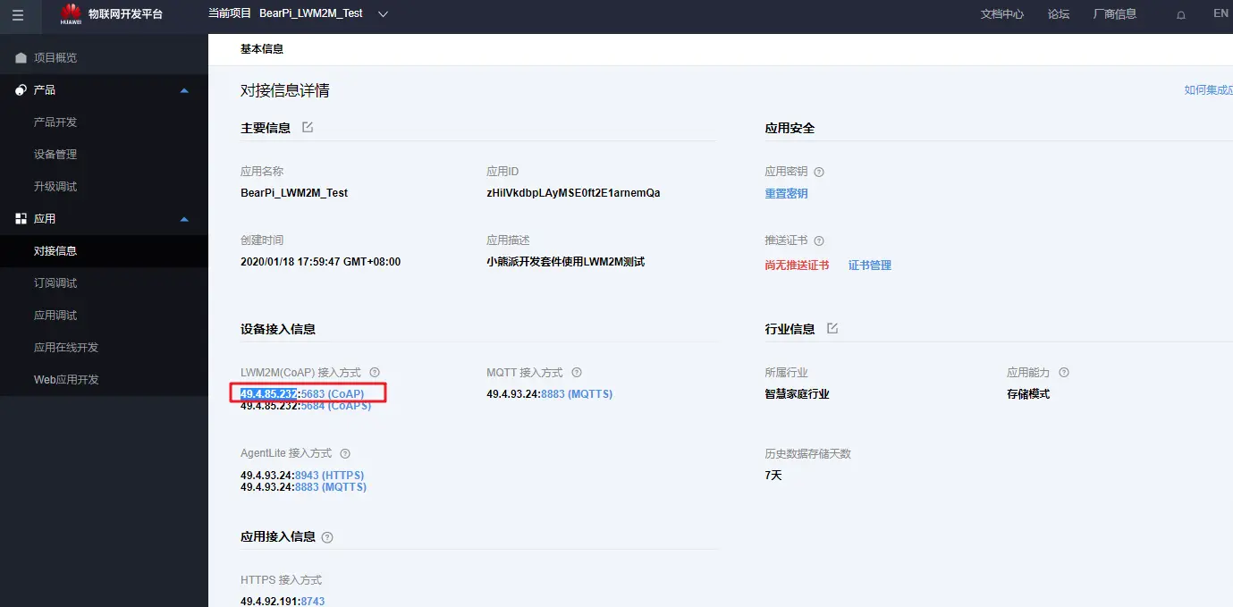华为云平台LWM2M对接信息可以在平台上查看: