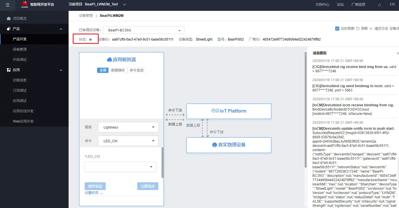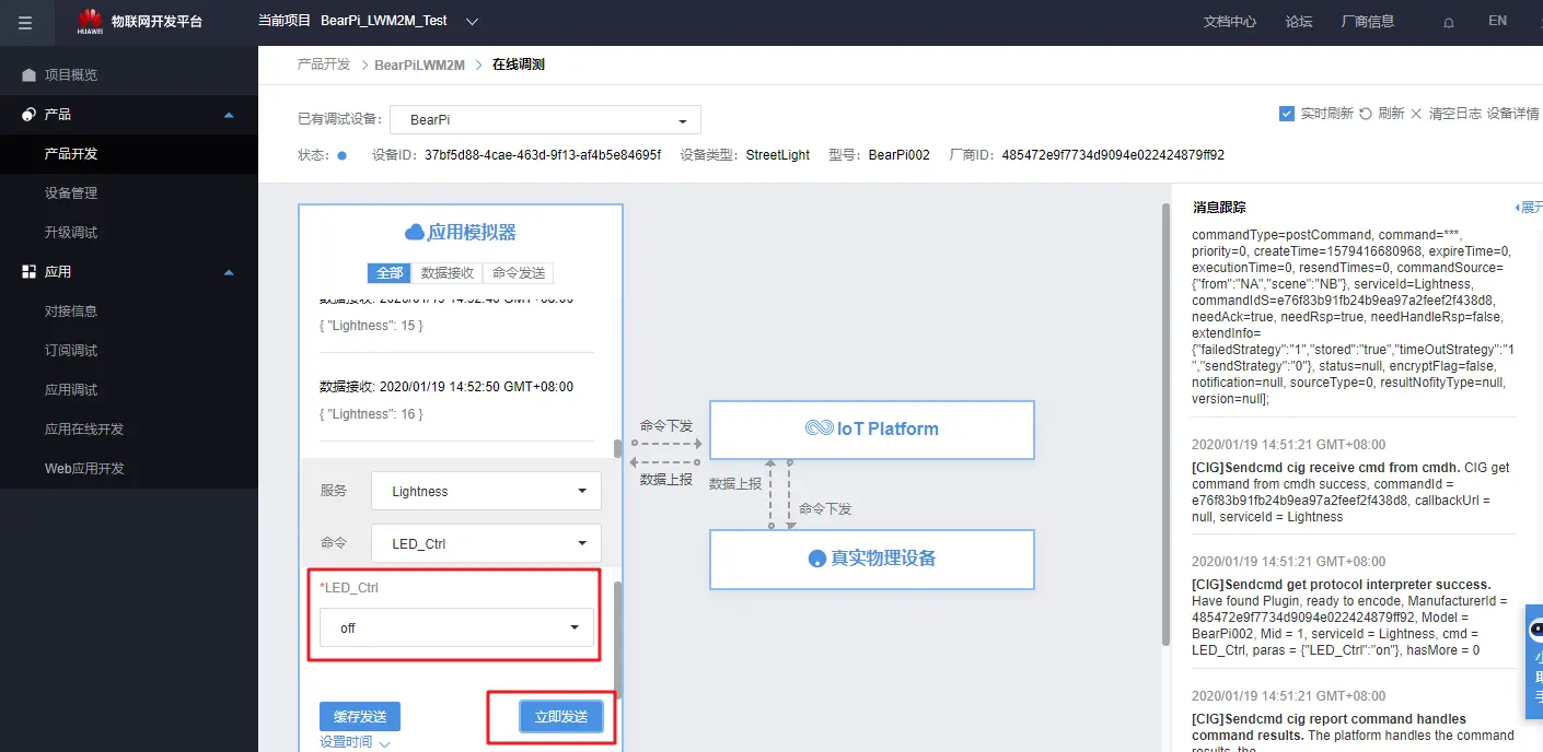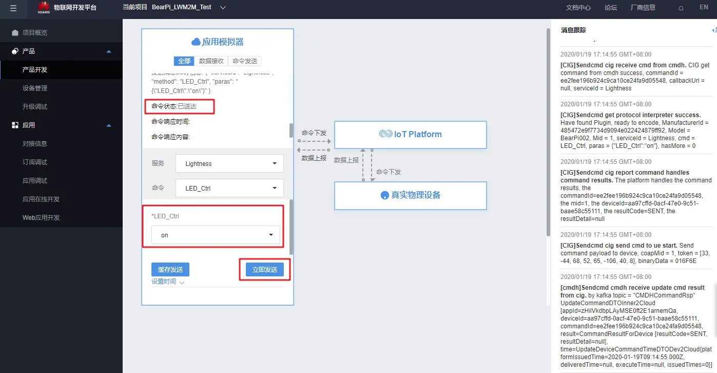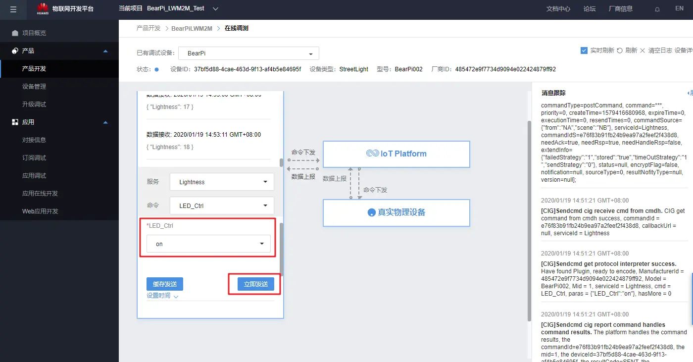 在华为云平台点击下发命令“on”:
