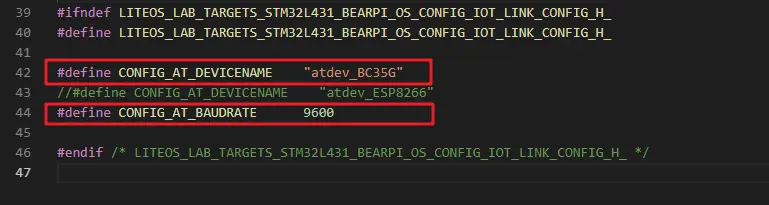 在工程目录中的OS_CONFIG/iot_link_config.h文件中,配置BC35-G设备的波特率和设备名称: