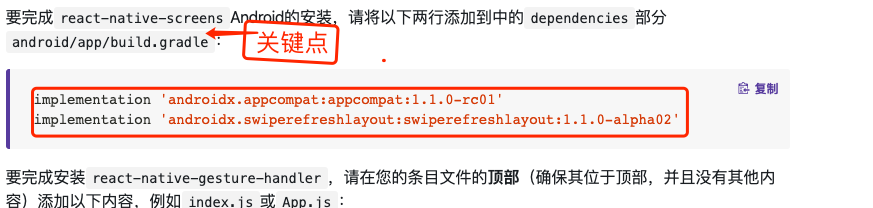 安卓端 -> 安装yarn add react-native-screens, 在build.gradle文件的dependencies增加: implementation 'androidx.appcompat:appcompat:1.1.0-rc01'