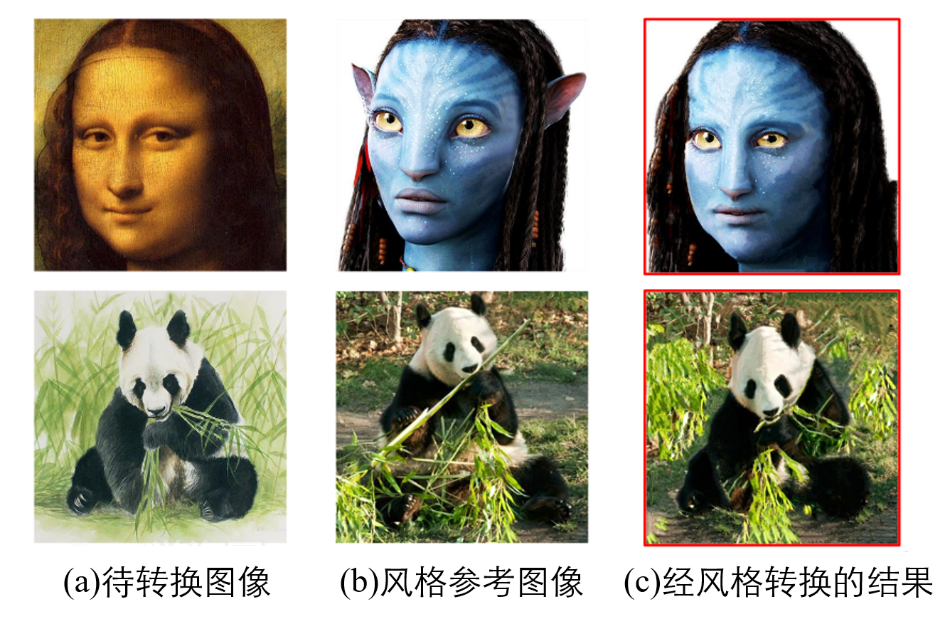 比如下图(c)具有(a)的轮廓,相应位置的内容几乎是一样的。但是整幅图像的属性(比如颜色,纹理)都变成了(b)的。阿凡达画风的蒙娜丽莎,原本为绘制的熊猫(a)转换成了真实风格的熊猫(c)。这一系列图像风格(包括纹理和色域色调)发生变化但维持基本形状轮廓不变的的图像处理,被称为图像风格转换。