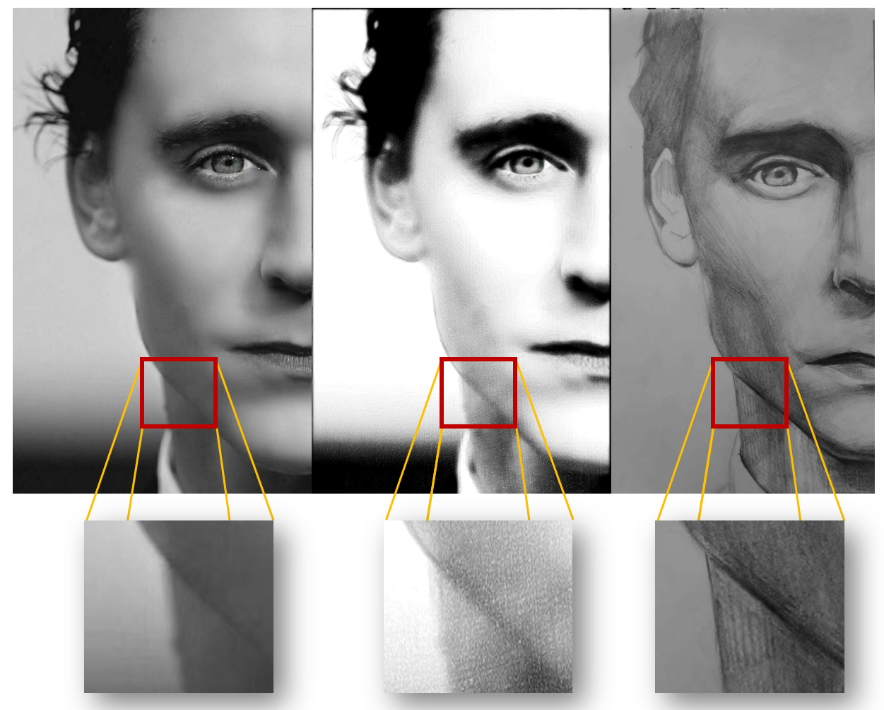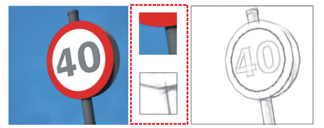 通过观察我们不难发现,我们可以发现线稿与tone局部纹理是手绘稿中的显著特征。一副手绘图像可以简单的分为纹理与线稿,分别对应于视觉认知中的颜色(纹理)与形状(线稿),如下图所示。