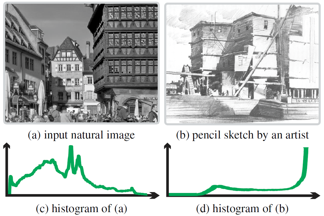 作者用以下的文字描述:自然图像的色调通常变化明显如(c)的直方图,而素描色调直方图服从特定的模式(certain patterns),如(d)的直方图。这是因为素描有两种基本色调:(1)高光区域;(2)阴影区域。在两种基本色调之间是过渡区域,用于丰富画面层次感。