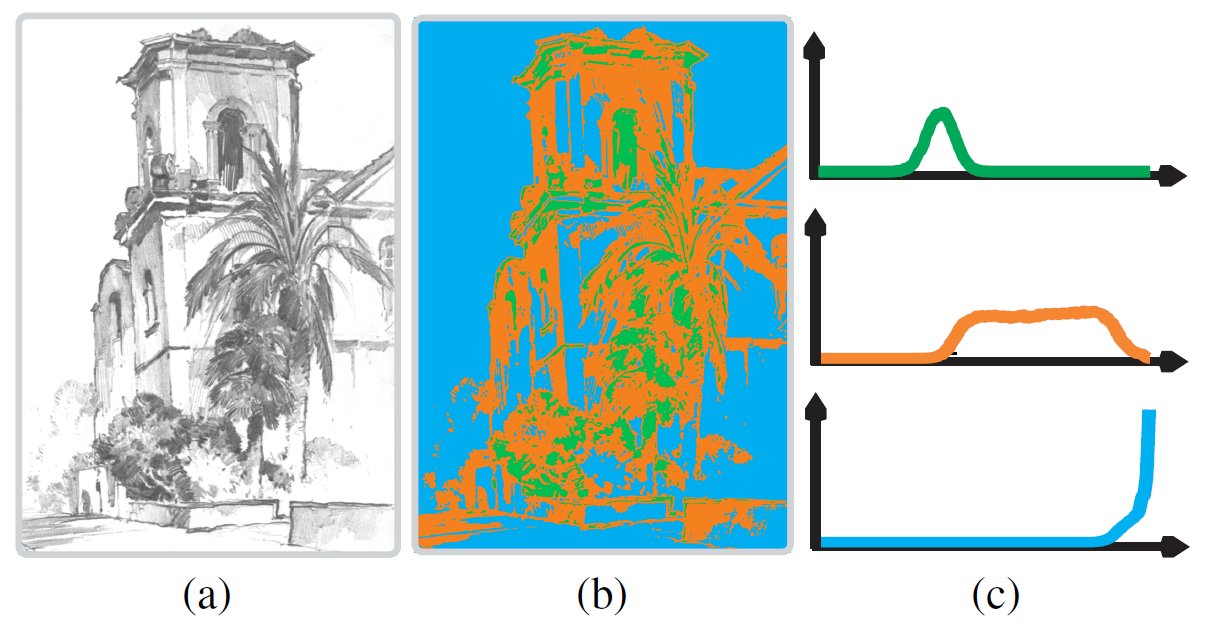 而如下图所示,(a)为一幅手绘素描,(b)为作者根据像素的值把(a)分成三层分别以绿、橘、蓝色标出(绿为最暗的一部分区域,橘)。根据作者的观察,给出了三层的色调分布。
