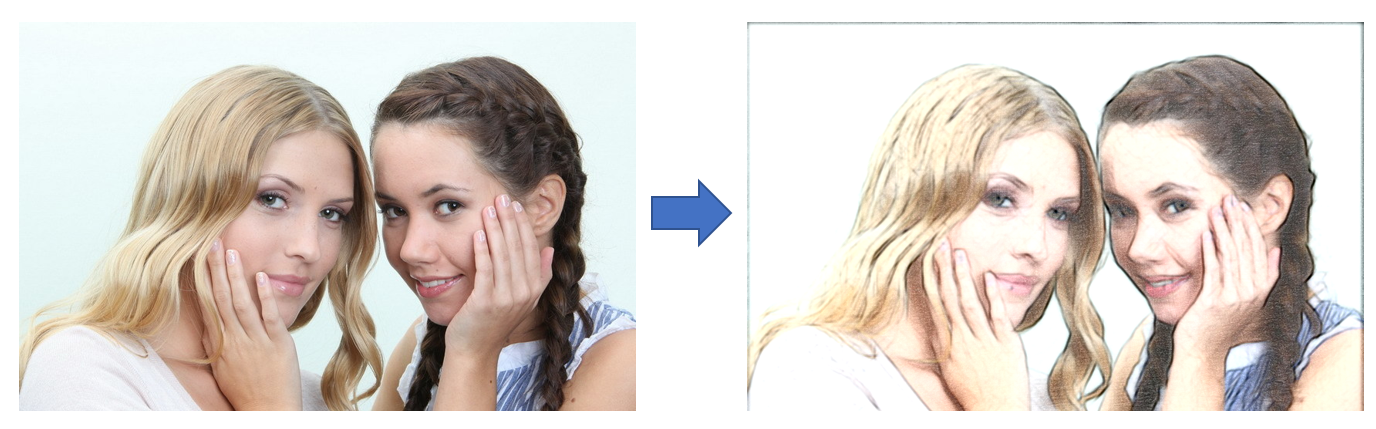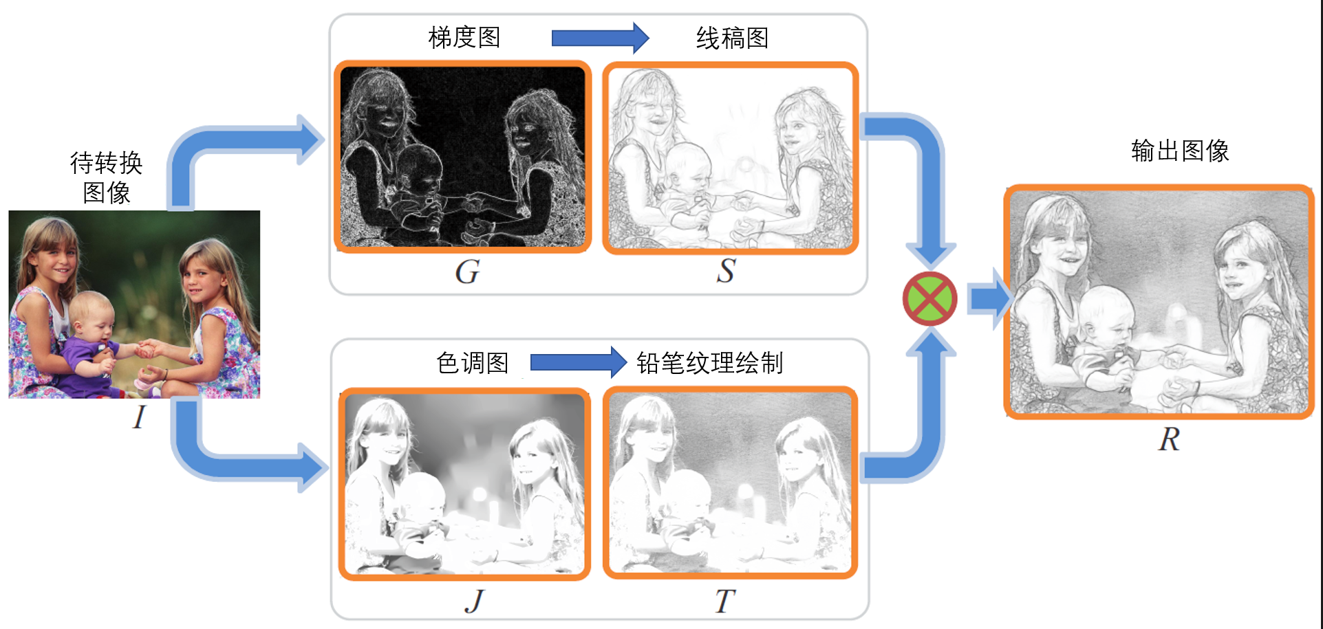 因此,如何实现图像手绘风格转换的问题可以得到更为具体的转化,即如何将图像的颜色转化为手绘风格中的纹理并且将图像的边缘转化为手绘风格中的线稿。在这里,(我们用到了一种问题转化的思想,把一个笼统的抽象的问题(怎么转化风格)通过实际的问题分析,转化成了更具象化的问题(如何实现A到B,C到D的转换),即通过转化问题并解决被转化后的问题来解决原问题,这是一种非常常见的研究方法和解决问题的方法)。