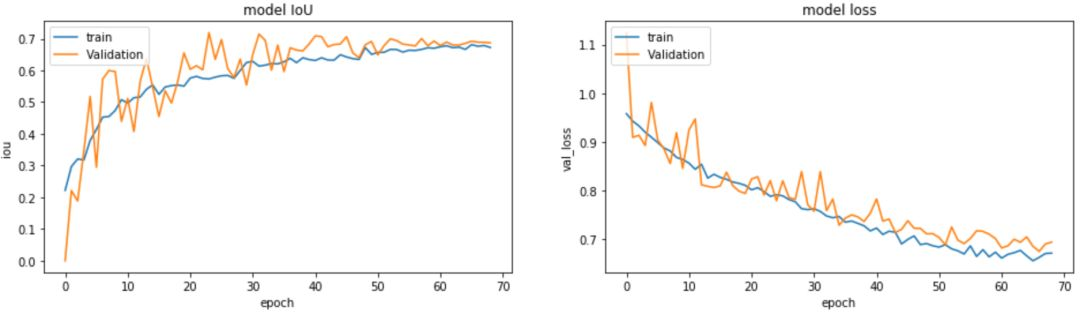 训练数据的 loss 跟验证数据的 loss 的走势对比,训练数据的 IoU 跟验证数据的 IoU 的走势对比。