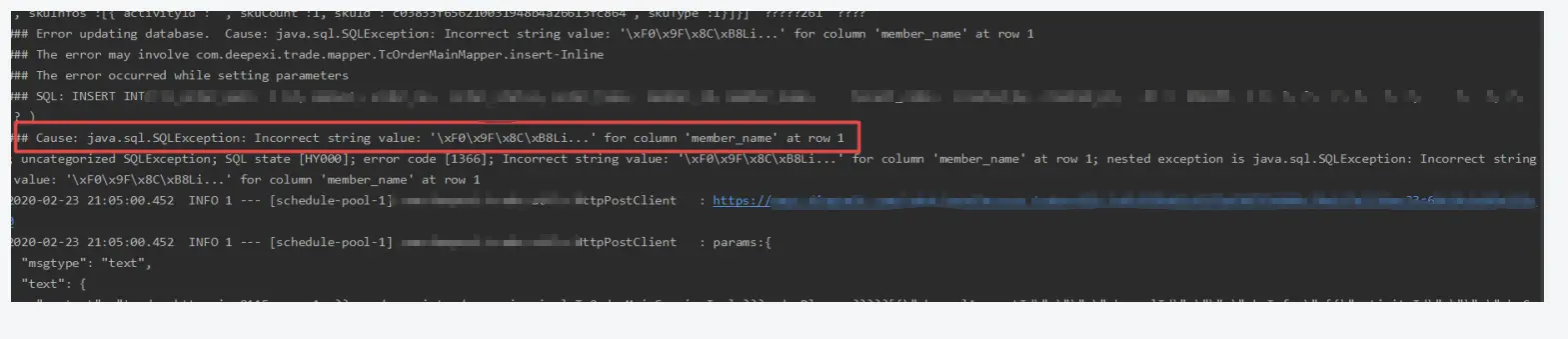 经过排查,原来是某接口的保存接口在接收微信传来的微信昵称往我们中心数据库插数据的时候由于附带emoji,报错了!