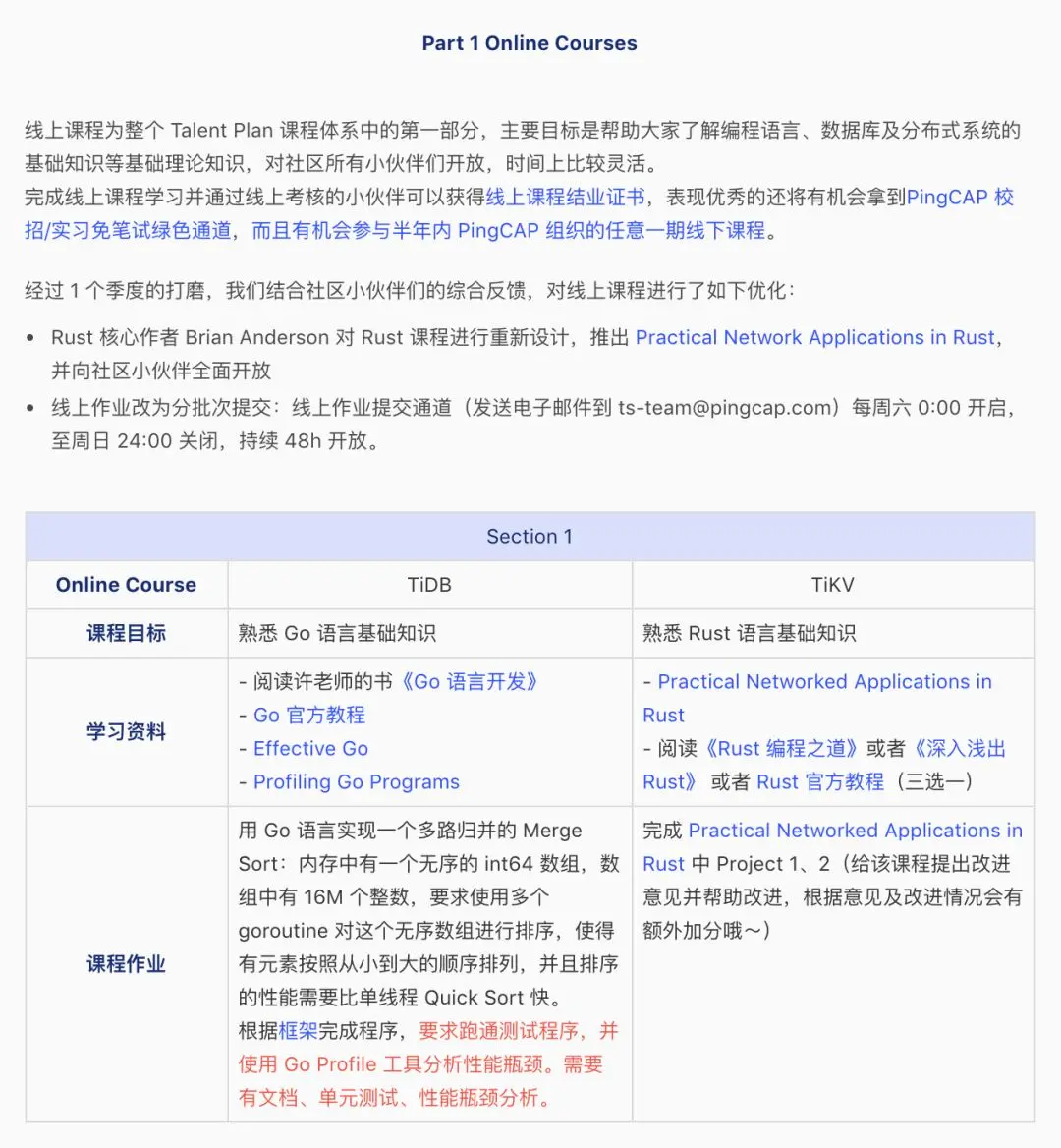 PingCAP Talent Plan 是一项进阶学习计划,内容涵盖:语言学习(Go/Rust),分布式系统、数据库基础知识,和配套项目实践作业。课程内容层层递进,分为线上和线下两个部分: