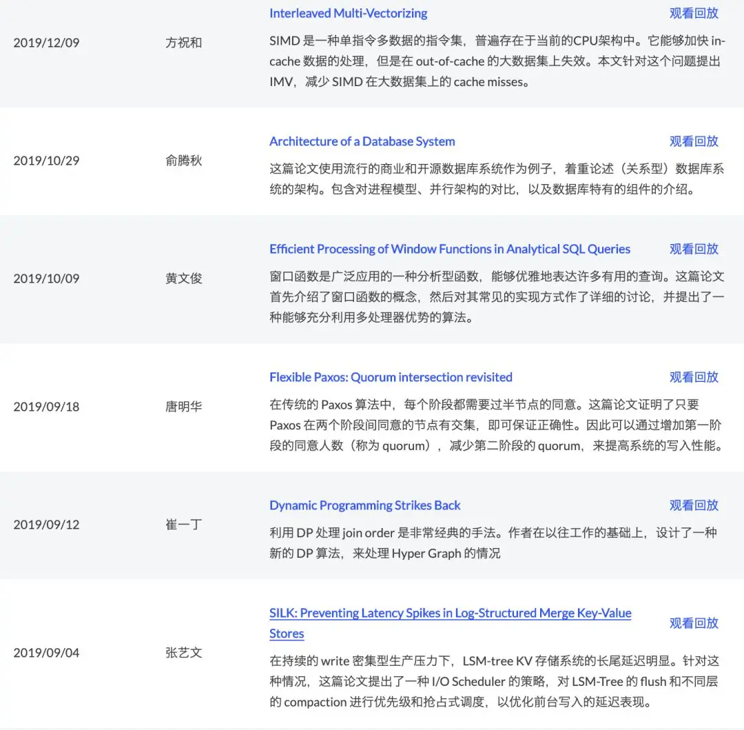 说到前沿理论学习,不得不提论文宝藏。我们目前已经小范围举办了 22 期线上直播 Paper Reading,讲师有来自 PingCAP 的小伙伴,也有 TiDB 开源社区活跃分子,论文选择都非常硬核,有经典的算法、架构,也有最新的学术研究成果,下面是部分截图: