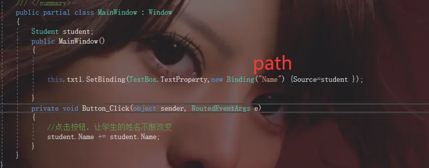 我们需要通往它的道路(Path),Binding的Path是一个PropertyPath类型,参数是一个string。也就是属性的名称(Name)。