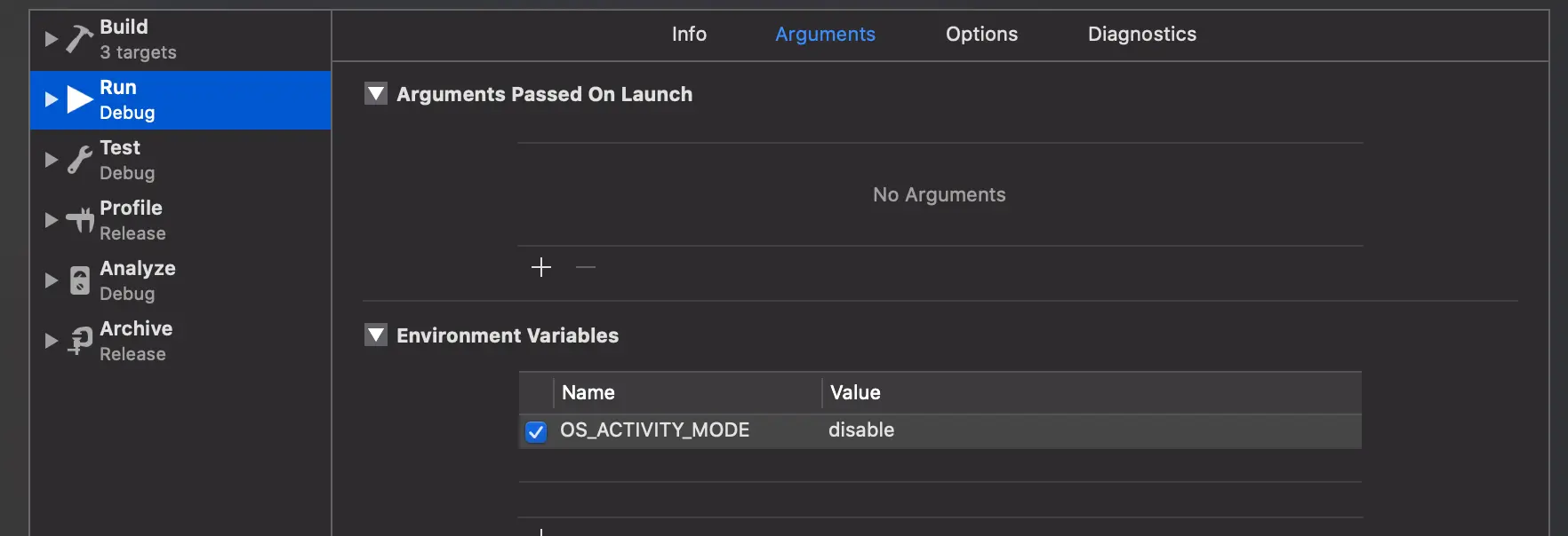 - 在 Environment Variables 添加设置 OS_ACTIVITY_MODE = disable
