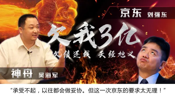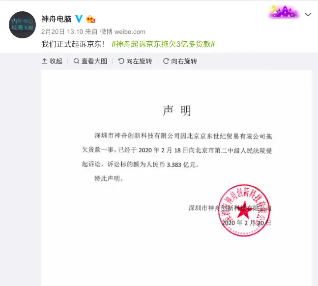 2月20日,神舟电脑在微博公开指责京东,称其拖欠其3.383亿的货款没有归还,并将京东告上了法院。神舟电脑董事长吴海军在微博上也向京东和刘强东喊话,称“欠账还钱,天经地义。我们正式起诉京东!”