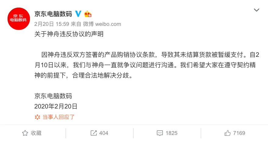 对此事,京东似乎并没有太放在心中,只用了旗下小号京东电脑数码微博回应:因为神舟违反协议条款,才导致其未结算货款被暂缓支付。